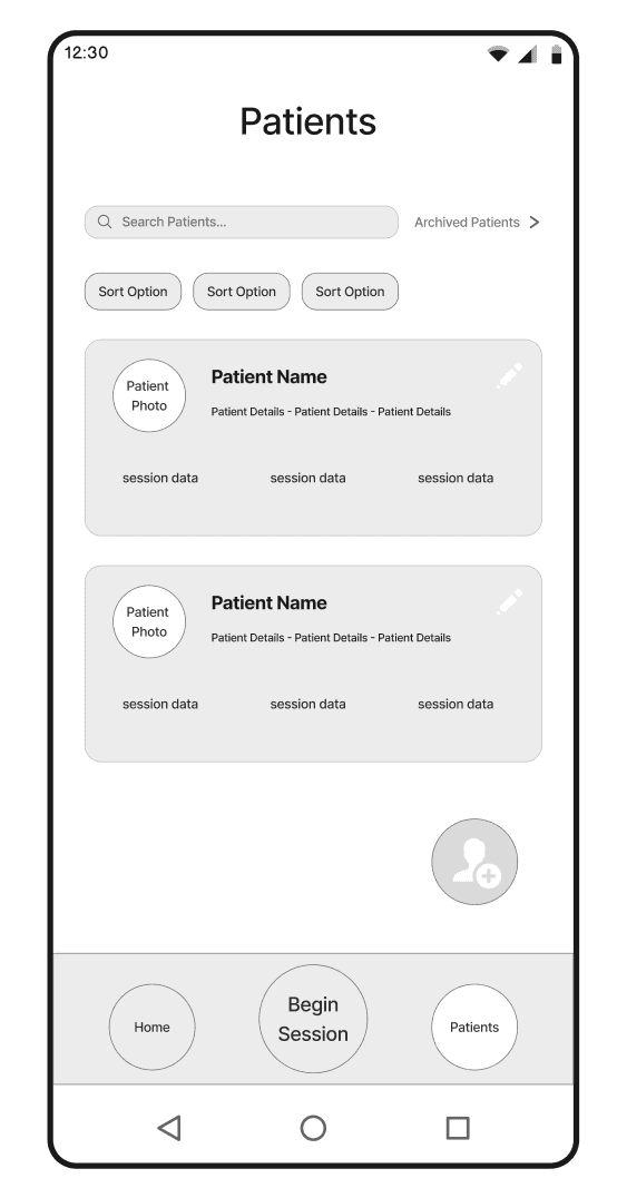 Design Focus: Clear hierarchy within the cards, flexible filter and search options, separating inactive from active patients