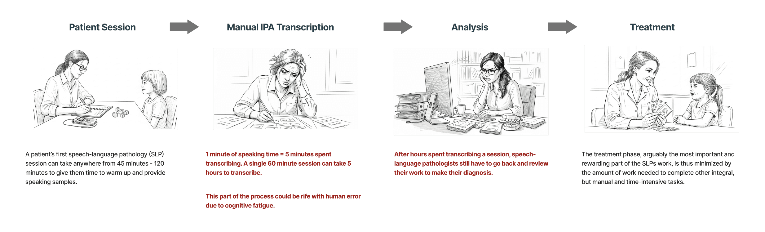 In particular, she identified how SLPs constantly balance time and accuracy when manually transcribing patient sessions into the International Phonetic Alphabet (IPA). This phoneme-to-grapheme conversion is a core part of their daily work and often requires hours of focused effort after sessions, increasing fatigue and the risk of error. It also minimizes time spent provide treatment to patients