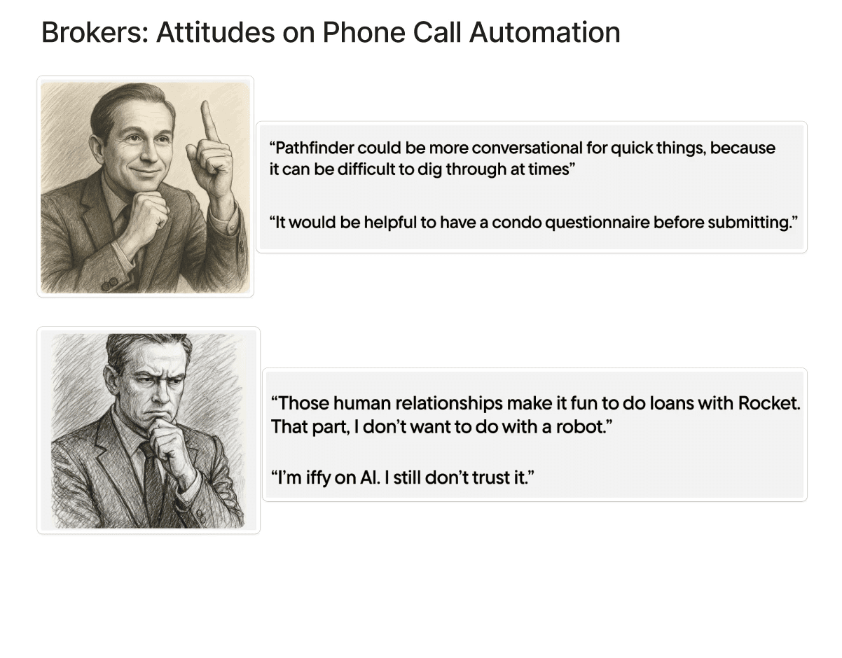 I proposed adding the third research question about receptiveness to automation largely because we lacked insights into broker and underwriter trust in AI. If our goal was to strategize so that Rocket Pro Assist was taking the common, easy questions off underwriters' plates to build trust, then we needed to actually benchmark what that trust looked like. We set the team up to get additional insights into underwriters' perceptions of AI before a full implementation of Rocket Pro Assist, compared to after. It allows us to understand how our AI products compare to the general sentiment of our broker users, and whether confusion and frustration from brokers increased or decreased with the new releases.