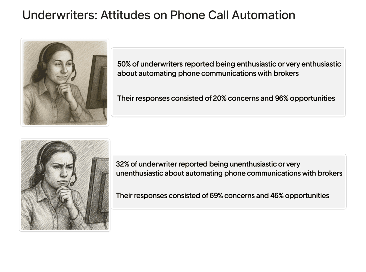 Brokers were asked questions outlining their entire experience of calling underwriters. We asked them about why they called, what guidance they were looking for, the responses they received, and more about how they feel about the process. At the end, we turned the questions towards AI focusing on if and how they currently use it, as well as their thoughts on having it as an alternative for them calling the underwriters.