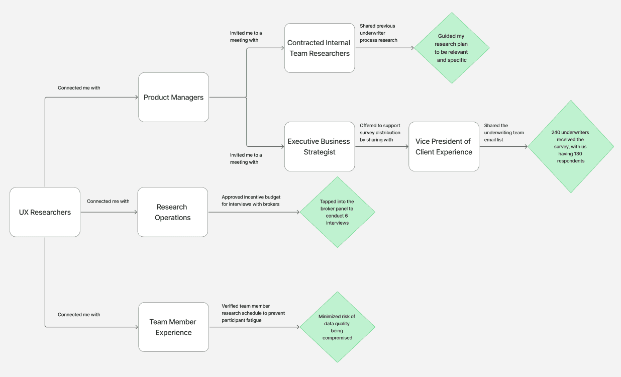 We tapped into our broker panel inviting around 100 individuals to schedule interviews after doing an initial analysis of the survey results. This helped us validate our findings, while directly digging into brokers' experiences of calling underwriters.