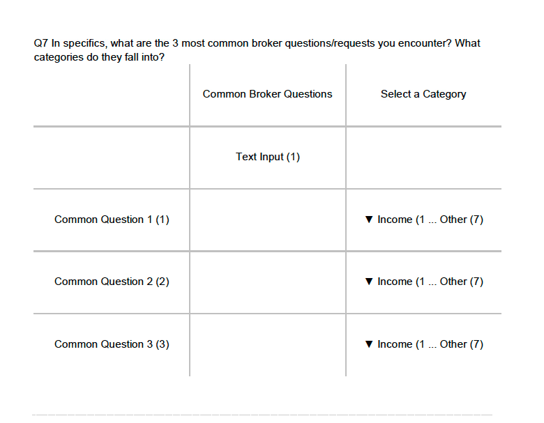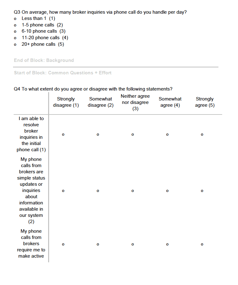 Underwriters were provided with question categories based on past operations data and an open-ended option, then asked to pick their top four most common broker question categories. We then asked them to rank these categories in terms of effort, based on time taken and depth of knowledge needed to respond. Then, we had them provide examples of the 3 most common questions they receive from brokers, and categorize them.