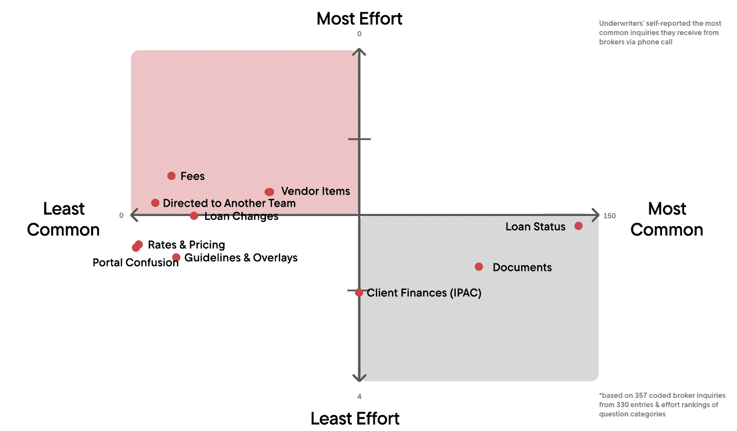 My research focused on one specific area of the broker experience that we already knew ate into both brokers’ and underwriters’ time: brokers calling underwriters when they ran into snags with a loan. We knew this was a pain point because of the following data gathered by a team of guerrilla researchers brought into to observe underwriters: