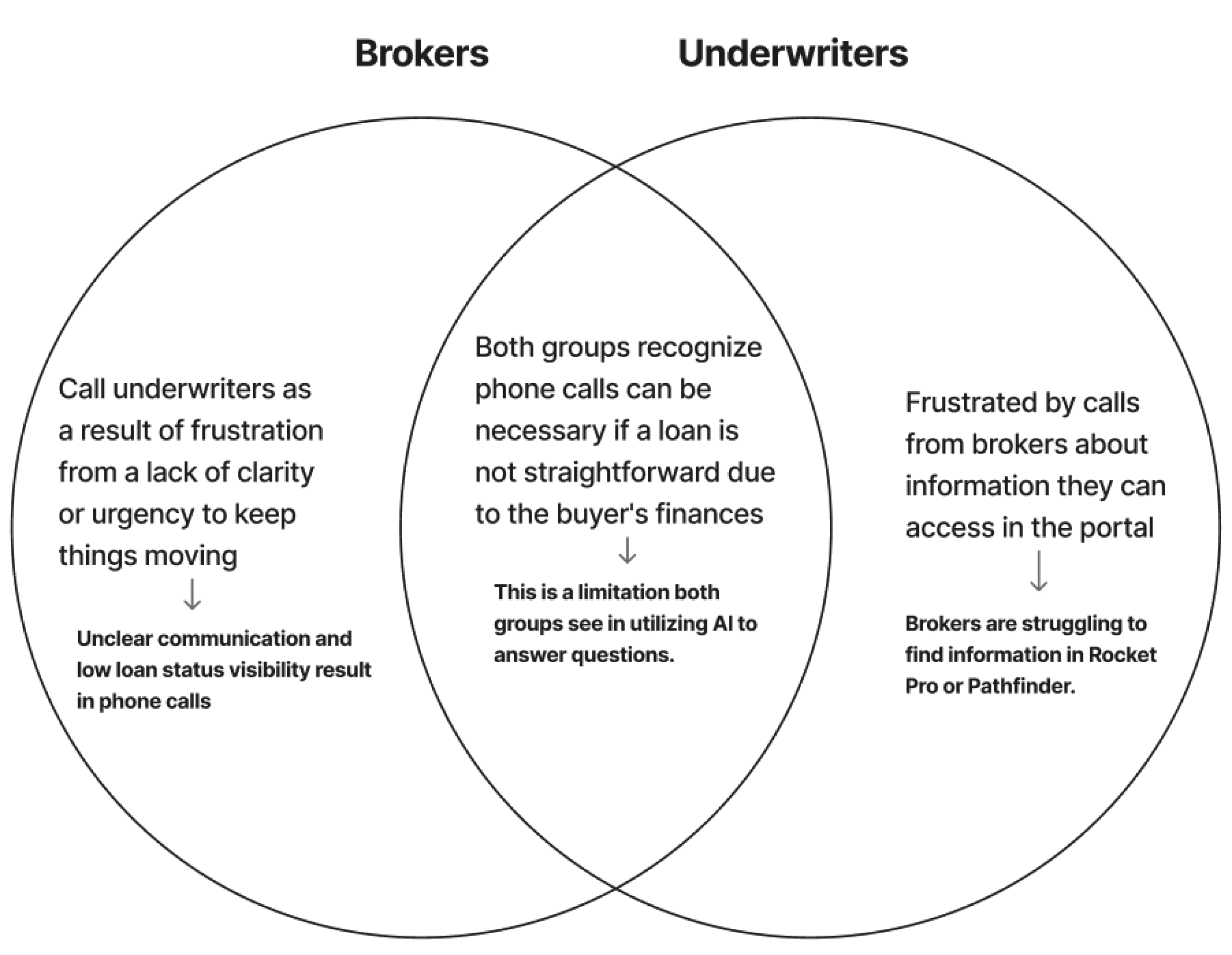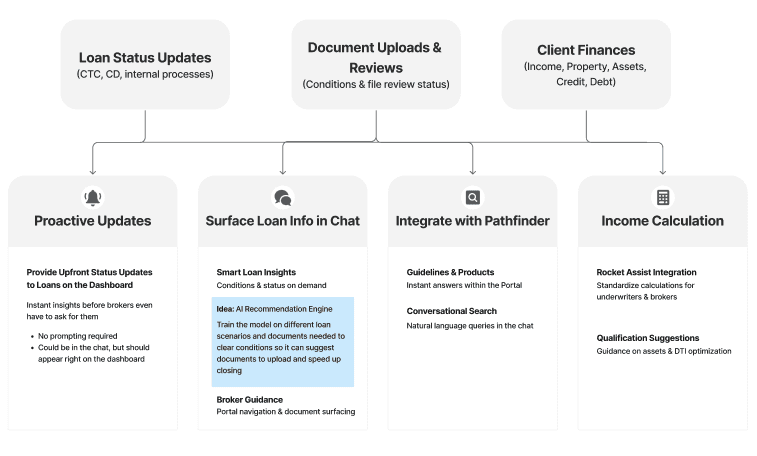 While these recommendations generally focused on the questions brokers call underwriters about and their solutions, I also highlighted the importance of bringing the value of AI to our users, rather than expecting them to put in the additional effort to learn the value of AI. This could come in the form of insights on the dashboard that guide brokers based on their current pipelines, guidance based on past loans with similar circumstances, etc. What matters most is that we are delivering valuable information to them sooner, and making it clear it was done with Rocket Assist to build trust.