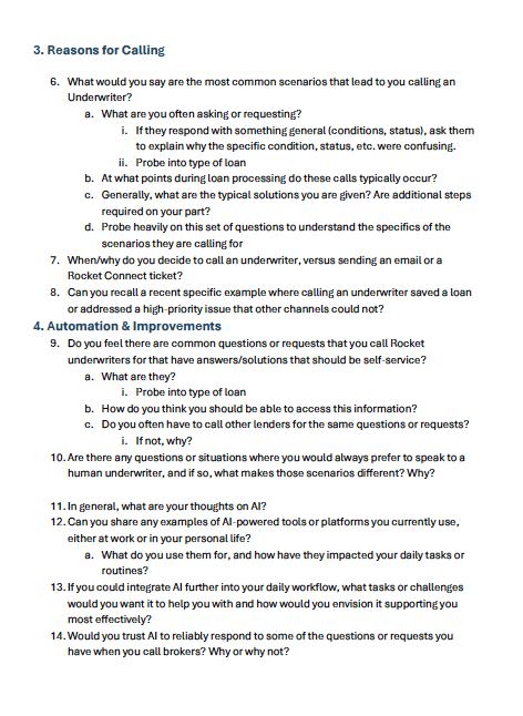 Conduct a survey with Rocket’s underwriters to get a broad view of the common questions brokers call for and the effort needed to resolve them
