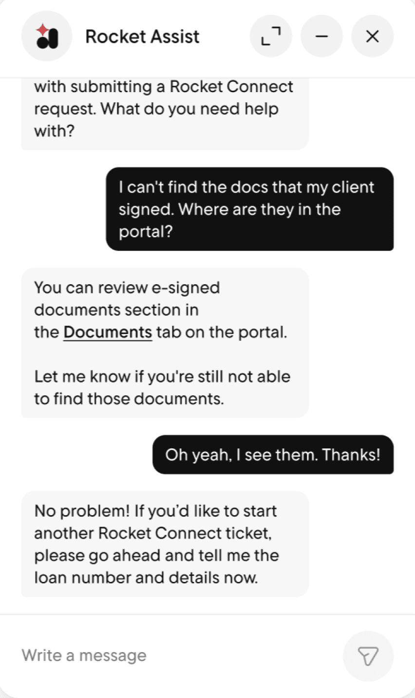 In August of 2025, the Rocket Pro product team implemented Rocket Assist, a consumer-facing chat bot into the Rocket Pro broker platform. It drastically improved the broker user experience by allowing them to submit support tickets directly in the portal, rather than through a separate application. This shortened the time needed and effort for brokers to request assistance, boosting user satisfaction. This prompted the product team to ask what more should the chat bot be able to do?