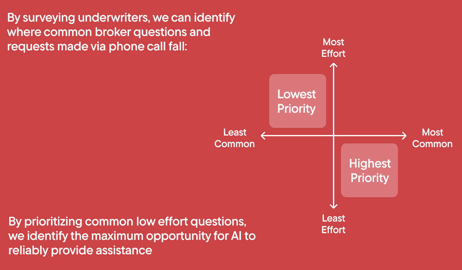 I proposed prioritizing these frequently asked, lower-effort questions because they would introduce the least room for error, allowing us to focus on the long-term strategy of building trust in our AI-powered systems with brokers. By cross-referencing the effort of the response to the frequency of the questions being asked, we can ensure the questions we target are actually relevant.