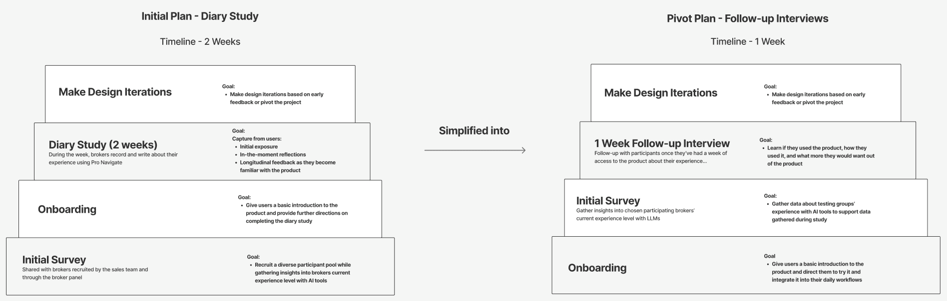We simplified the approach to follow-up interviews after participants were granted access to Pro Navigate for a week and encouraged to integrate it into their workflows. Since this project was operating on a tight timeline, we could not afford the participant drop-off often associated with non-incentivized diary studies, nor the added legal and security exposure.This approach shortened the timeline and increased the likelihood of collecting usable data, even if it meant sacrificing some depth.