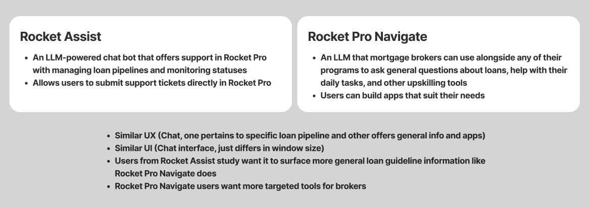While Rocket Pro Navigate and Rocket Pro Assist serve different purposes, user feedback on what to add to Navigate closely mirrored what we had previously heard for Assist. Because the two experiences are nearly identical in both interface and content, we identified a risk that users would struggle to understand when to use each tool, largely because we as a team struggled to consistently define the difference. With the user experiences being so similar, we worried users would carry negative perceptions from one product into the other.